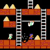另外,当玩家站立在梯子上或在绳索的两端位置也可以挖洞,这让玩家可快速的挖出垂直的一排洞,很多关卡要透过这样的挖掘方法来解决。